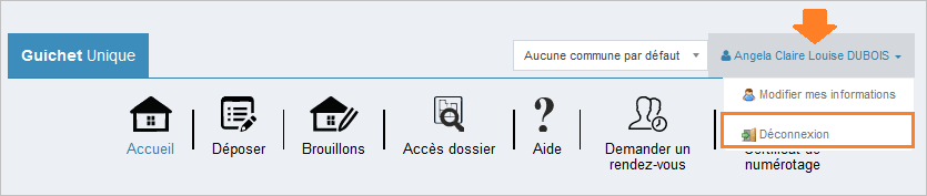 Guide du guichet uniqueMon compte Comment me déconnecter du Guichet ? Déconnectez-vous depuis le menu {Utilisateur}\Se déconnecter. Exemple :