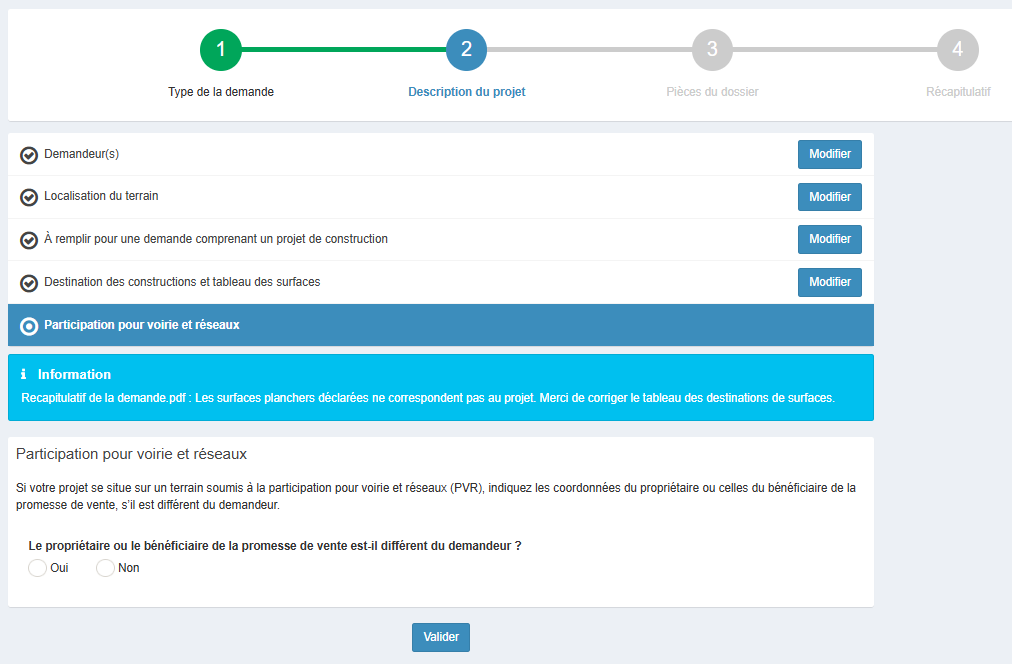 Les informations que vous avez saisies précédemment sont ensuite affichées. Complétez/modifiez ensuite votre demande initiale en validant chaque section de votre demande.