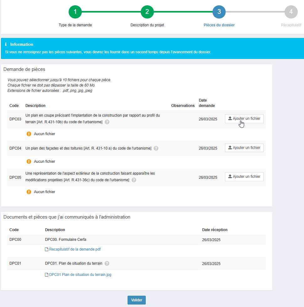 Dans le cas où des demandes de pièces sont associées, retrouvez la liste des pièces demandées ainsi que les éventuelles observations associées. Complétez alors les pièces demandées en respectant le nombre, la taille et le format des fichiers indiqués.