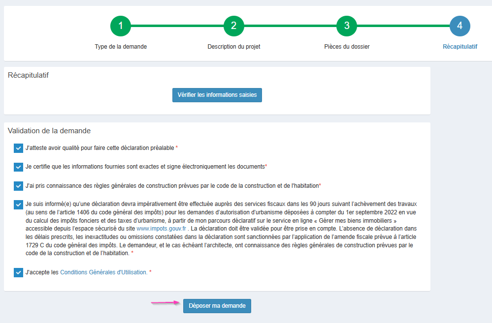 Contrôlez le cas échéant les informations saisies via le récapitulatif. Cochez ensuite les cases à coches ci-dessous puis déposez votre demande. Les éléments fournis seront directement adressés au service compétent.