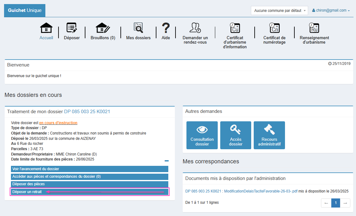 Dans le cas où vous souhaitez retirer votre demande, utilisez la fonction [Déposer un retrait] depuis la vignette du dossier en page d’accueil (ou l'état d'avancement de votre dossier).
