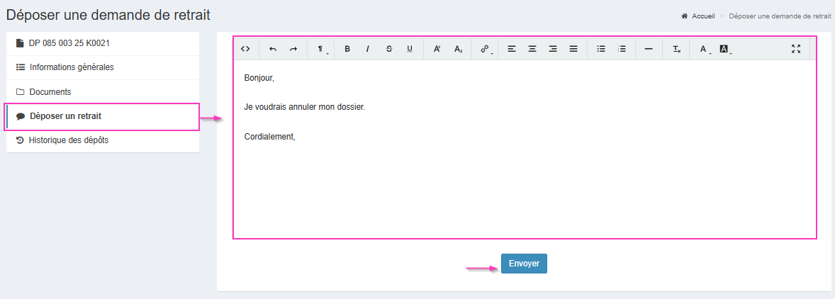 Vous serez alors redirigé sur l'état d'avancement du dossier à l'étape [Déposer un retrait]. Votre message est pré-enregistré. Il ne vous reste plus qu'à le compléter/le modifier si besoin avant de cliquer sur [Envoyer].