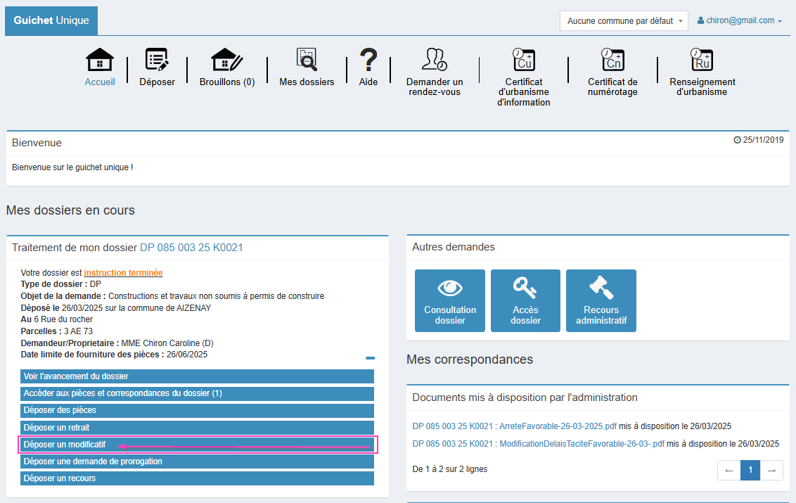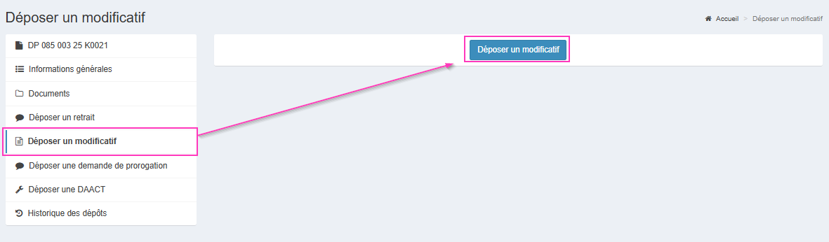 Dans le cas où vous souhaitez déposer un permis modificatif, utilisez la fonction [Déposer un permis modificatif] depuis la vignette du dossier (ou l'état d'avancement de votre dossier).