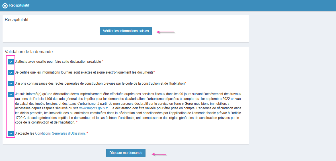 Contrôlez le cas échéant les informations saisies via le récapitulatif. Cochez ensuite les cases à coches ci-dessous puis déposez votre demande. Les éléments fournis seront directement adressés au service compétent.