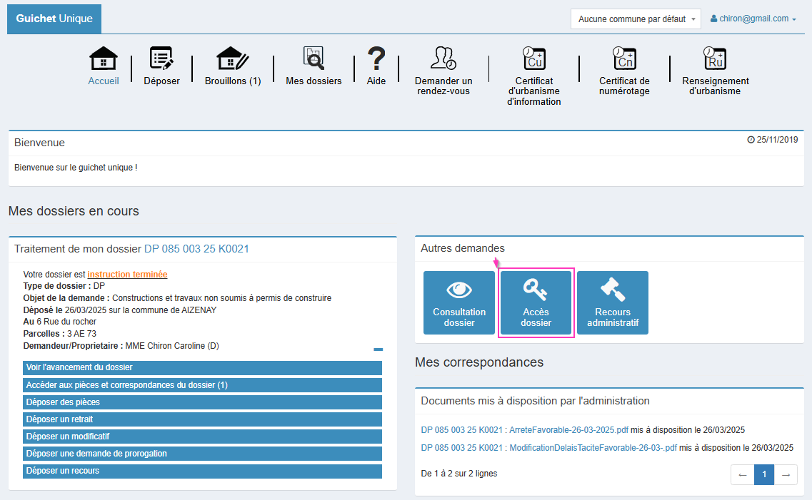 Une fois la demande envoyée, vous accédez directement au dossier en cours/terminé (selon l'état d'avancement du dossier).