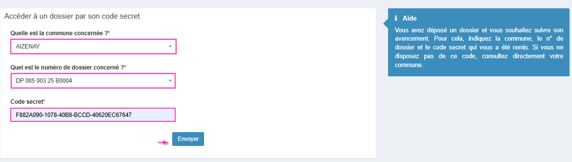 Sélectionnez alors la commune, la référence administrative du dossier (en respectant les espaces) puis le code secret qui vous a été fourni puis cliquez sur [Envoyer]. |