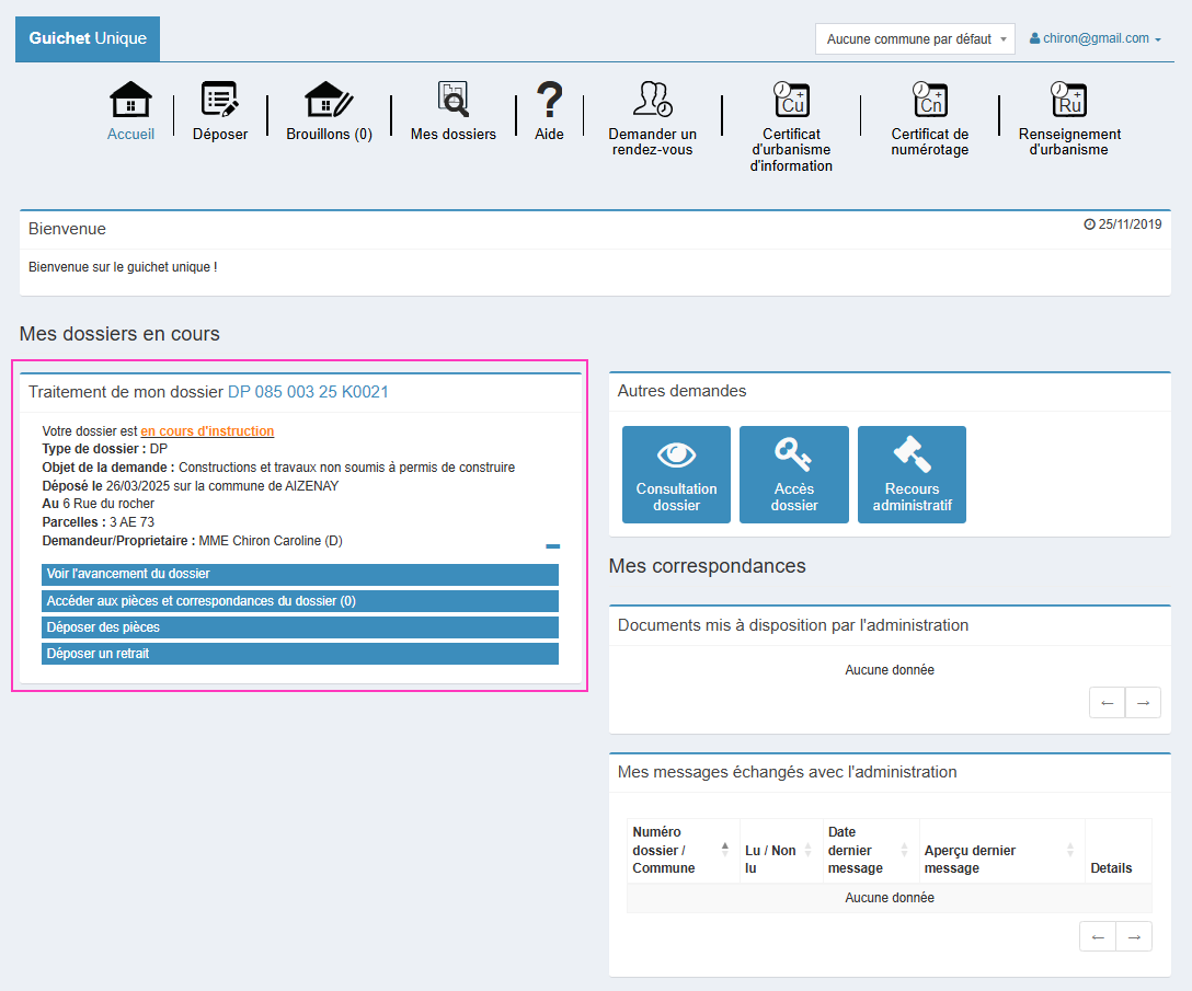 La liste de vos dossiers en cours est disponible directement en  page d'accueil, sous la forme de vignette dynamique.